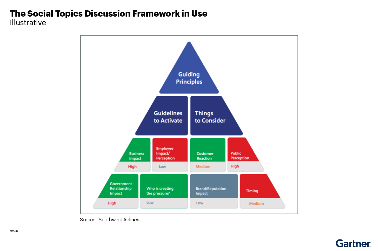 Work with your team and broader organizational leadership, including the CEO and C-suite, to design a process that determines which societal issues to respond to and which stance to take. Ground the framework in organizational values and include diverse stakeholder input. Ensure the framework addresses the differences between longer-term issues and emergencies, providing guidance on timely communication on when a day or two is too long to wait to make a statement or to take action.